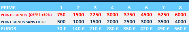 4. Les Prim€ achetées ou offertes donnent droit à un crédit de points bonus. Ces points bonus ne sont pas qualificatifs, ils ne sont pas pris en compte dans le calcul des points nécessaires à la qualification Premium.